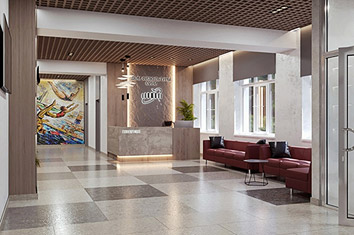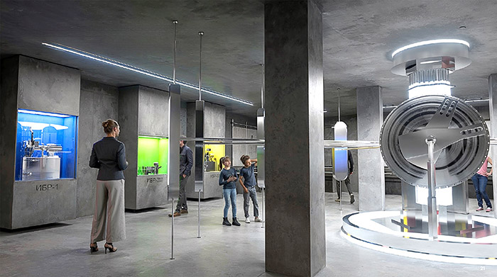 Эскиз одного из залов Культурно-исторического комплекса По реконструкции здания проведены инженерные изыскания, разработан эскизный проект общественных и функциональных зон нового помещения, ведутся мероприятия по формированию штата, цифровизации и подготовке временных выставок. На лето будущего года запланировано создание экспозиции и поставка оборудования. Завершить работы планируется к ноябрю 2026 г., а в декабре открыть музей. Музей науки и техники ОИЯИ, который существует с 1993 года, будет преобразован в Детский центр. Как дополнение и расширение этого комплекса создается Выставочный зал, он будет находиться на втором этаже Дома международных совещаний, где раньше была столовая. Общая площадь зала 700 кв. метров. Здесь планируется размещать выставки о научных достижениях ОИЯИ и мирового научного сообщества посредством художественно-исследовательского метода - популяризировать научные знания через диалог с дубненцами и гостями города. Помимо выставочной зоны будет оборудован лекционный зал, зона арт-резиденции (пространство для работы и диалога с приглашенными художниками), зоны для отдыха и общения. Работы по этому проекту идут два года. Проведен полный демонтаж помещений второго этажа, возведены перегородки, сделаны чистовая стяжка пола и потолка, монтаж систем вентиляции и отопления, установлены двери, заменено остекление, напольное покрытие. Идет закупка мебели и оборудования. Столовая и проходная ЛФВЭ. Большая работа была проделана по благоустройству территории, прилегающей к проходной ЛФВЭ по ул. Академика Балдина, 4, с расширением разворотного автобусного круга. К маю следующего года здесь будет парковка с твердотельным покрытием на 181 машино-место, новые наружное освещение и ливневая канализация, остановочные павильоны, ограждения парковки и тротуары. Второй проект ЛФВЭ - модернизация столовой. Закончено проектирование, подготовлена рабочая документация, в ближайшее время начнется ремонт. Пансионат "Дубна" в Алуште. В 2024 году был начат цикл работ, чтобы повысить качество отдыха наших сотрудников. Построен бассейн, детские площадки, оборудуется сауна, после ремонта помещения обустраивается тренажерный зал. На следующий год планируется снос здания корпуса №1, ремонт крыши здания клуба-столовой. База отдыха "Липня". В этом году закончено строительство дома для персонала, обустроены детская и тренажерные площадки, отремонтирован основной причал с освещением, установлены видовые парковые качели, отремонтировано южное крыло главного корпуса с двумя номерами повышенной комфортности и причала для маломерных судов, обустроен пост охраны. Дом культуры "Мир". В прошлом году был разработан проект, который предусматривал капитальный ремонт Большого зала. В связи с тем, что зрительный зал имеет культурно-историческую ценность, в настоящий момент заключается договор со специализированной проектной организацией на уточнение проектной документации, чтобы максимально сохранить исторически ценные решения проектировки этого зала. Вместе с тем планируется замена инженерных систем, повышение уровня пожарной безопасности, оснащение зала современным медиаоборудованием. Причал яхт-клуба ОИЯИ. В этом году заменены строения, инженерные сети, освещение на территории клуба, обустроены береговая зона и территория, в