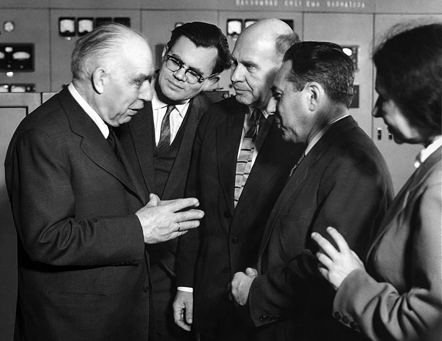 Нильс Бор, И. Д. Рожанский, Д. И. Блохинцев, В. П. Джелепов, С. И. Драбкина. 10 мая 1961 года. Фото Павла Зольникова