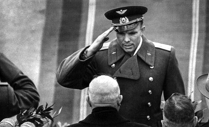 Ю. А. Гагарин докладывает Н. С. Хрущеву об успешном возвращении из космического полета во время торжественной встречи в аэропорту «Внуково». 14 апреля 1961 года. Фото РГАСПИ