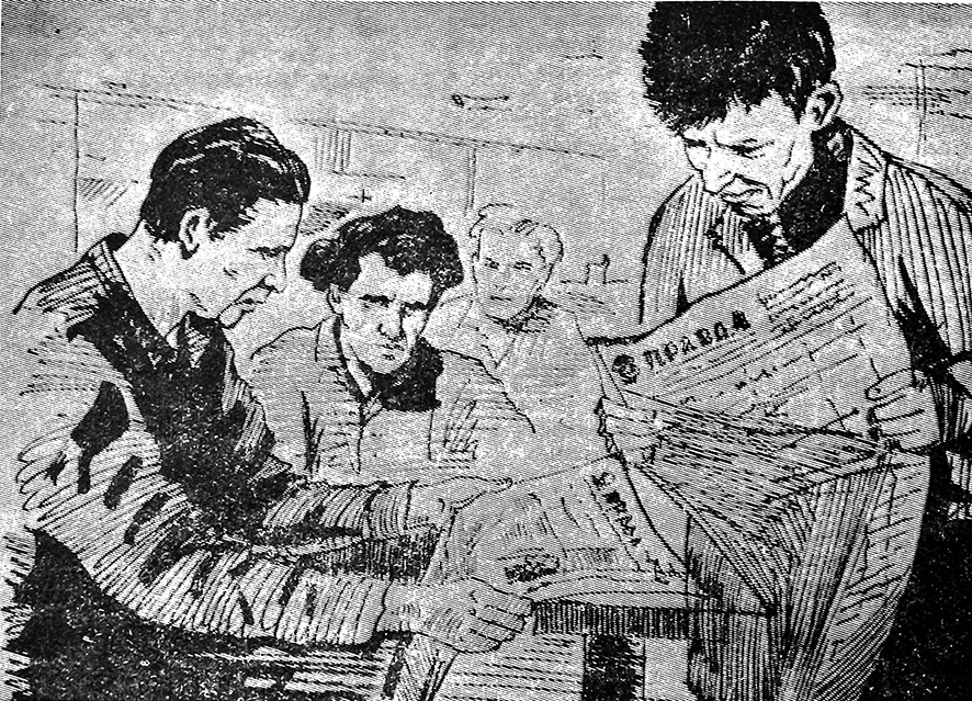 Трудящиеся нашего города проявляют огромный интерес к материалам XXII съезда КПСС. В обеденные перерывы, после работы в цехах, отделах, на строительных участках проходят читки докладов Н. С. Хрущёва, выступления ораторов на съезде. Рисунок Вячеслава Бочкарёва. Из газеты «За коммунизм» Александр РАСТОРГУЕВ | ||||||