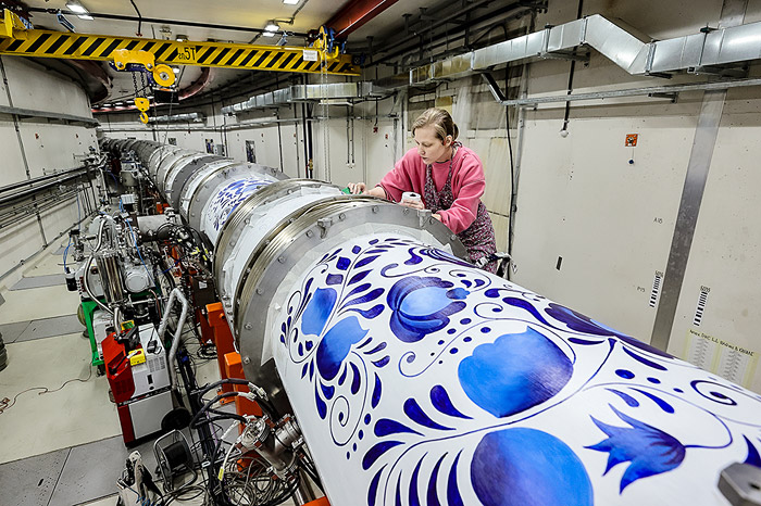 Наука и искусство Гжель - техника правильных движенийУскорительный комплекс NICA, расписанный гжельскими узорами, - это событие удивило и порадовало. Оригинальная идея, профессиональное исполнение, скорость, с которой всё было сделано… Анастасия Злобина, руководитель Клуба художников ОИЯИ "Кварки", рассказала о том, как складывалась работа, о своих эмоциях и особенностях монументальной росписи.Как вы восприняли задачу расписать криостат? - Восприняла с большим энтузиазмом и в самом хорошем настроении, ведь задача была поставлена в мой день рождения. Просто подарок, учитывая, что училась я, в первую очередь, именно технике народных росписей. Это подразумевает тонкое владение кистью, то, что я люблю и умею. Правда вот объект необычный и большой. Но и это не напугало, ведь монументализм мне по душе. Кажется, сочетание синего узора на белом фоне довольно распространено в мире. - Это правда, подобные мотивы, элементы и цвета встречаются в культурах многих стран. Например, в европейском фарфоре: в Португалии, в Голландии, в Чехии, а также в Китае и в Мексике. Сама гжель хорошо узнаваема в мире.