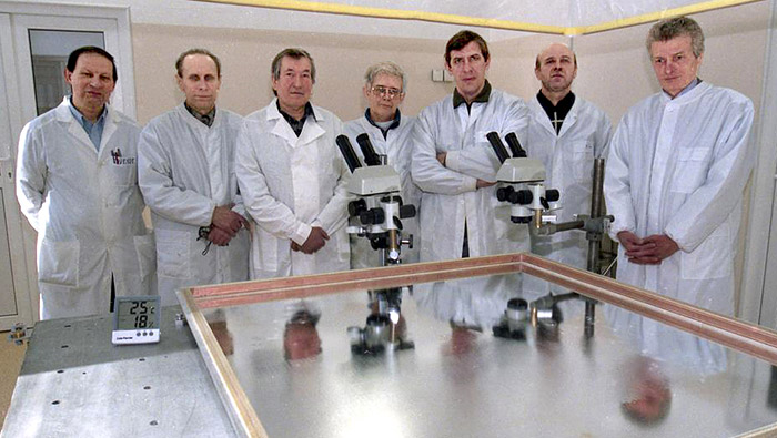 Начальник сектора ЛВЭ Ю.В.Заневский (справа) с сотрудниками лаборатории В рамках Европейской коллаборации коллектив под руководством профессора Ю.В.Заневского участвовал в создании спектрометра HADES и исследованиях на SIS-18 (GSI, Германия). Когда в ОИЯИ был инициирован проект создания нового исследовательского центра на базе коллайдера NICA, Юрий Вацлавович не остался в стороне. С согласия коллектива и начальника группы С.П.Черненко он принял решение активно участвовать в этих работах. При его жизни, с учетом международного опыта, была разработана концепция и технический проект время-проекционной камеры (TPC) - основного трекера многоцелевого детектора MPD, а также ее ключевые подсистемы: газовая, охлаждения, лазерной калибровки, высоко- и низковольтного питания и система считывающей электроники на 100 тысяч каналов регистрации. После ухода Юрия Вацлавовича работы продолжил его ученик Сергей Александрович Мовчан. После утверждения технического проекта коллектив приступил к практической реализации TPC при участии специалистов из Беларуси (БГУ, НИИ ЯП БГУ, НИИ ФХП БГУ и др.). В настоящее время создание и тестирование TPC для многоцелевого детектора MPD находится в завершающей стадии. Время идет, сменяются поколения, но заложенные Юрием Вацлавовичем научные и человеческие основы продолжают жить в делах его учеников и коллег. Сотрудники сектора № 1 НЭОМД ЛФВЭ