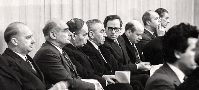 На сессии КПП ОИЯИ директора лабораторий А.М.Балдин, Г.Н.Флёров, И.М.Франк, В.П.Джелепов, 1975 год - мы оказываемся вместе в группе ученых ОИЯИ и советских ученых на Конференции по физике высоких энергий и ядерной физике, проходившей в США. Балдин выступает с докладом "О взаимодействии тяжелых ионов при высоких энергиях", говорит об исследованиях по релятивистской ядерной физике в Дубне. Я вижу, как со свойственной ему эмоциональностью он защищает приоритет работ теоретиков ОИЯИ, установивших поведение структурных функций многокварковых систем, известное теперь как "правила кваркового счета". Кто мог тогда знать, что спустя тринадцать лет эти работы удостоятся Ленинской премии и в числе лауреатов будет Балдин, который внес свой вклад в "установление динамических закономерностей в кварковой структуре элементарных частиц и атомных ядер". Восьмидесятые годы были, по-видимому, самыми трудными в жизни Балдина. Это были годы создания Нуклотрона со сверхпроводящими обмотками магнитов - в то время новым и малоизученным способом эффективного ускорения. Необычность этого дела состояла также и в том, что создавался ускоритель в основном силами самой Лаборатории высоких энергий. Обычно базовые установки такого масштаба проектировались и изготавливались институтами и предприятиями Средмаша - здесь же всё делалось своими силами с помощью лабораторных и центральных экспериментальных мастерских. На плечи Балдина как директора ЛВЭ ложилась огромная ответственность и нагрузка по выбиванию денег и ресурсов, по работе с вышестоящими инстанциями, где он не всегда находил понимание. Надо было поддерживать дух и целеустремленность коллектива, особенно когда приходилось разрешать возникающие проблемы как в самой работе, так и в организации взаимодействия различных структур, ее обеспечивающих. В то время научная жизнь в Институте тесно переплеталась с общественной. Нуклотрон строился в годы перестройки, когда постоянно проводились партийные и профсоюзные собрания, собирались активы специалистов по обсуждению планов развития Института, его научной и производственной базы, строительству жилья, социальным и кадровым вопросам. Балдин много выступал, разъяснял научную политику и программу развития ЛВЭ, касался вопросов жизни Института и страны в целом. И здесь он в полной мере использовал свои незаурядные способности талантливого ученого, опытного лектора - популяризатора науки, человека эмоционального и способного заражать своими идеями аудиторию. Надо сказать, что партийные комитеты ЛВЭ и Института много сделали для реализации намеченной задачи - пустить в строй эту новую базовую установку. И уже в начале 90-х она была запущена и стала работать на новые эксперименты. Это было огромное достижение. И если оценивать человека по делам его, имея в виду принцип: что было до него, и что появилось его стараниями, - то, по моему мнению, Балдин мог бы предъявить из того многого, что сделано им в жизни, прежде всего Нуклотрон. Именно он был главным его создателем "от и до", начиная с оригинальной идеи принципа работы и до запуска современной базовой установки, построенной силами мобилизованного и заряженного его идеями коллектива ЛВЭ. Вспоминая Александра Михайловича, нельзя не сказать о стиле его работы как руководителя. Его характеризовала настоя