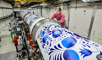 The NICA Accelerator Complex, painted with Gzhel patterns, surprised and pleased with this event. Original idea, professional execution, speed which everything was done with... Head of the JINR Artists' Club "Quarks-Sparks" Anastasia Zlobina spoke about how the work had developed, about her emotions and the features of monumental painting.