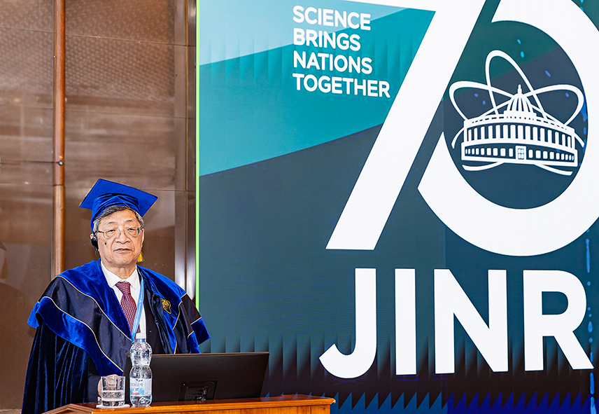 Профессор Чэнь Хэшэн Доклад «О юбилейной медали «70 лет ОИЯИ» был представлен главным научным секретарем ОИЯИ Сергеем Неделько. Комитет полномочных представителей поддержал предложение дирекции ОИЯИ об учреждении такой награды. Главный научный сотрудник Института истории науки и техники имени С. И. Вавилова Российской академии наук Юрий Батурин представил интересный и информативный доклад «ОИЯИ: карта возможностей, улицы знаний и научная сплоченность коллектива». В нем были рассказаны новые факты из истории города, показано, как из первоначальных базовых установок выросли целые направления физики, сложились лаборатории Института и сам город, проводилось сравнение с еще одной мощной стройкой страны тех лет – космодромом «Байконур». А также были представлены перспективы развития ОИЯИ. Диплом и мантию почетного доктора ОИЯИ в торжественной обстановке получил профессор Чэнь Хэшэнь (Китай). Следующее заседание Финансового комитета состоится 5 ноября, а следующая сессия КПП пройдет 6-7 ноября в Улан-Баторе, Монголия. Галина МЯЛКОВСКАЯ